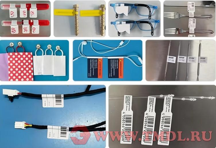 Применяемые этикетки: самоклеящиеся этикетки, самоклеящаяся плёнка, коды электронного наблюдения, штрих-коды и т.д.
