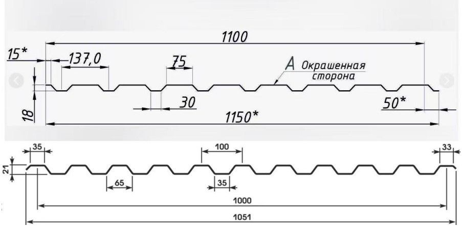 Верхний слой: трапециевидный профиль с эффективной шириной формовки 1050 мм.