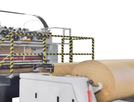 Участок приклеивания ручек: соединенный с машиной для ручек, он с помощью транспортной системы подает готовые ручки для приклеивания к бумажному полотну.