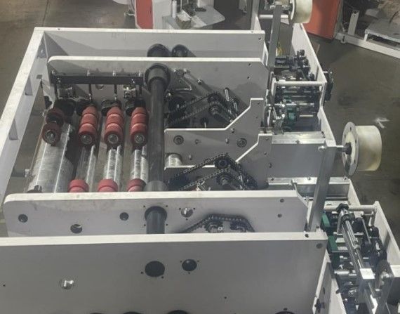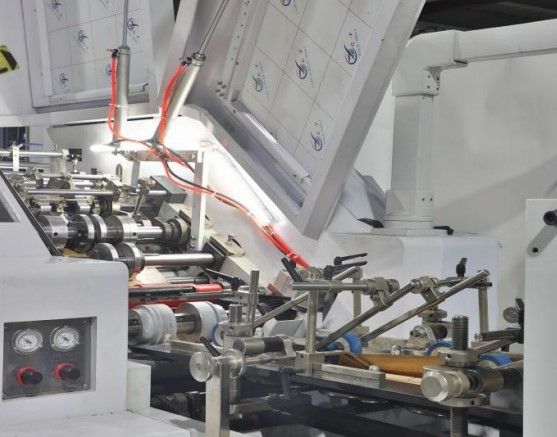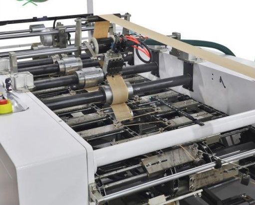 Основная часть машины для пакетов автоматически выполняет следующие операции с бумагой с приклеенными ручками: нанесение бокового клеевого шва, формирование трубки, резку, биговку (создание линий сгиба), нанесение клея на дно и формирование дна пакета.