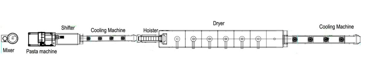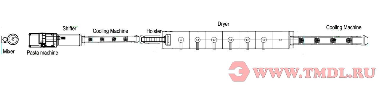 Технологическая схема: Смеситель → Винтовой конвейер → Экструдер для макаронных изделий → Просеиватель → Подъёмник → Пятиуровневая сушильная камера длиной восемь метров → Охладитель