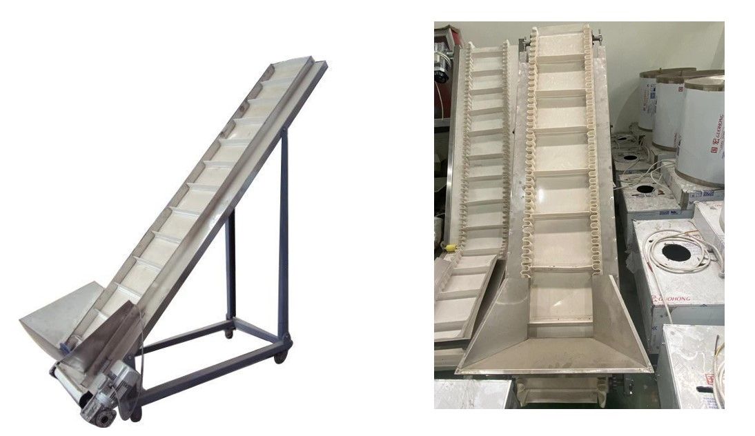 1. Части, контактирующие с продуктом, выполнены из нержавеющей стали. Материал приводной цепи пищевой ПВХ. 2. Двигатель известной китайской марки. |