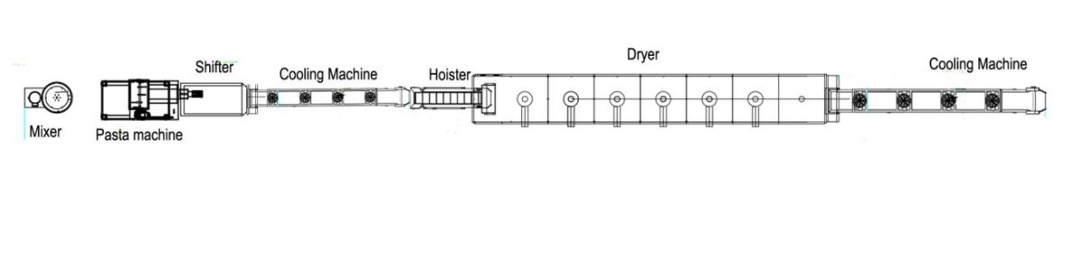 Технологическая схема: Смеситель→Шнековый транспортер → Машина для экструдирования макарон→Механизм перемещения→ Подъемник→ Семислойная восьмиметровая сушилка→Холодильная машина