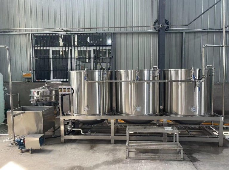 Трехбаковое варочное оборудование Включает: • 3 варочных бака • 1 кронштейн из нержавеющей стали • 1 комплект паровых трубопроводов • 1 комплект трубопроводов для суспензии • 3 регулятора температуры • 1 фильтр для соевого молока среднего размера • 1 варочная емкость • 1 насос для суспензии |