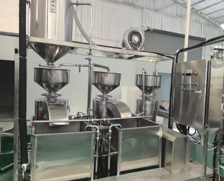 Трехстадийная мельница для соевого молока Включает: • 1 автоматическая машина для подачи бобов • 1 бункер для хранения бобов • 3 мельницы (200-200-200 #) • 2 машины для смешивания и погрузки жмыха • 2 бака для суспензии (большой и малый) • 1 рабочая платформа • 1 система управления • 1 насос для перекачки суспензии • 1 насос для удаления жмыха • 2 запасных измельчающих диска • 4 запасных сита |
