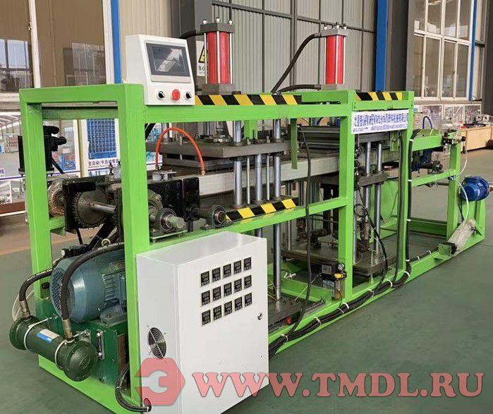 Полностью автоматическая машина для компрессионного формования, представляющая собой универсальную систему непрерывного формования и штамповки. Она объединяет в единую производственную линию следующие операции: подача материала, пластификация и нагрев, смыкание форм и формование, охлаждение и обрезка, гидравлическая пробивка отверстий и автоматическая резка.